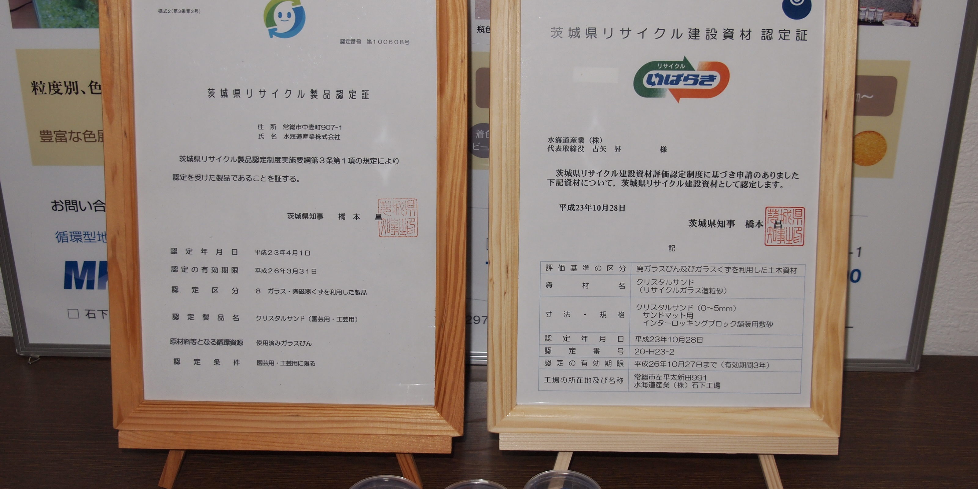 クリスタルサンドが茨城県土木部より、建設資材として認定されました。まだ、用途に限定がありますが、今後は多用途に使用できるように進めていきたいと考えております。生活環境部のリサイクル製品と合わせての認定となり、「安心」「安全」な製品の評価をいただきましたので、品質の管理には今までよりもさらに注意をして参りたいと思います。