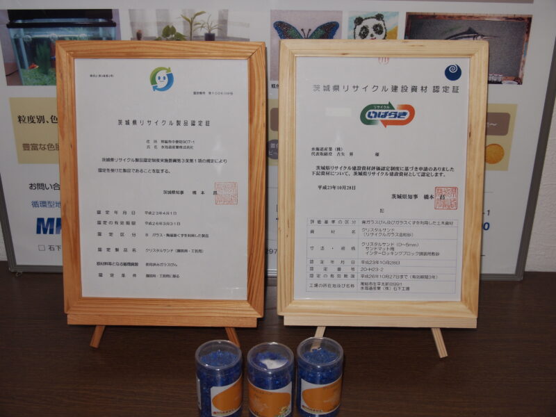 クリスタルサンドが茨城県土木部より、建設資材として認定されました。まだ、用途に限定がありますが、今後は多用途に使用できるように進めていきたいと考えております。生活環境部のリサイクル製品と合わせての認定となり、「安心」「安…